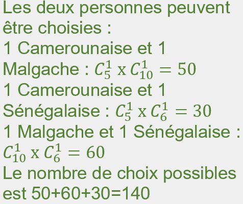 On veut choisir deux personnes de nationalités différentes parmi 5 Camerounais, 10 Malgaches et 6 Sénégalais.