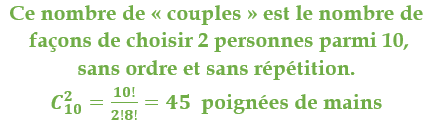 Détermine le nombre de poignées de mains échangées entre 10 personnes (on compte le nombre de « couples » qui vont se serrer la main).