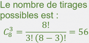 Une urne contient 5 boules blanches, 3 boules rouges toutes indiscernables au toucher. On tire simultanément trois boules dans l’urne. Quel est le nombre de tirages possibles ?
