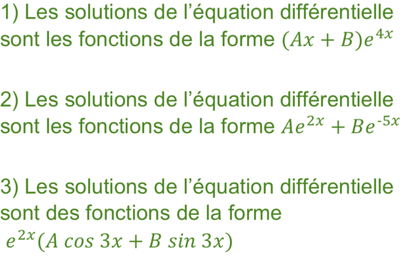 Résoudre dans IR les équations différentielles et déterminer la solution vérifiant la condition initiale donnée. 1) y’’-8y’+16y=0 2) y’’+3y’-10y=0 3) y’’-4y’+13y=0