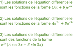 Résoudre dans IR les équations différentielles et déterminer la solution vérifiant la condition initiale donnée. 1) y’’-8y’+16y=0 2) y’’+3y’-10y=0 3) y’’-4y’+13y=0