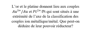 Au et Pt sont parmi les métaux les moins oxydables : Cela est en accord avec leur pouvoir réducteur très faible.