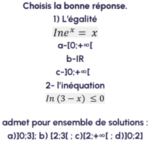 1) La bonne réponse c) [2;+∞[ . En effet lnx existe ssi x∈ ]0;+∞[ 2) la bonne réponse est b) [2;3[