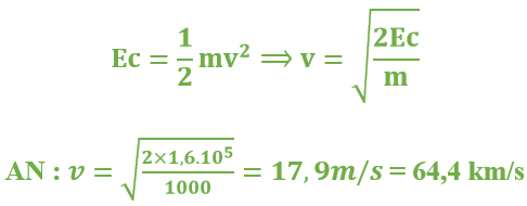 Dans le référentiel terrestre une voiture de masse m=1,0t a une énergie cinétique Ec=1,6.105J. Calcule sa vitesse v et exprime la en kilomètre par heure.