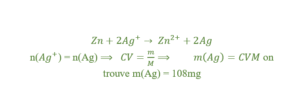 Dans 100mL de solution de nitrate d’argent 0,01mol/L, on plonge une lame de zinc. Calculer à la fin de la réaction : La masse d’argent déposé.