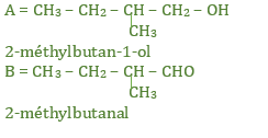 En faisant passer les vapeurs d’un alcool A sur du cuivre à 300°C, on obtient un corps B qui chauffé avec un excès de solution de dichromate de potassium en milieu sulfurique donne l’acide-2-méthylbutanoïque. Donne les formules semi-développée et les noms des composés A et B.