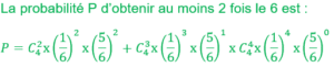On jette un dé cubique parfaitement équilibré dont les faces sont numérotées de 1à 6. Calculer la probabilité d’obtenir au moins deux fois le 6 en 4 lancers successifs.