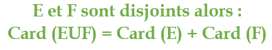 Compléte l’égalité suivante : Soit E et F deux ensembles finis disjoints. On a Card (E U F) = …………………….