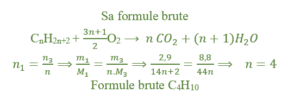 La combustion dans le dioxygène de 2,9g d’un alcane gazeux a donné 8,8g de dioxyde de carbone. Détermine sa formule brute.