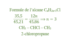 Un alcane contient en masse 45,86% de carbone et 45,21% de chlore. Détermine sa formule semi-développée sachant que sa molécule contient deux groupes méthyl et un atome de chlore.