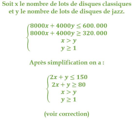 Disposant d’un crédit de 600.000F, le directeur d’une discothèque désire acheter des disques compacts pour une valeur d’au moins 320.000F. Il veut se procurer des disques classiques qui valent 8000F pièce et des disques jazz qui valent 4000F pièce. Par ailleurs, il tient à acheter plus de disques classiques que de disques de jazz. Enfin, il ne peut acheter les disques compacts que par lots de 10 et il désire au moins un lot de disque de jazz.