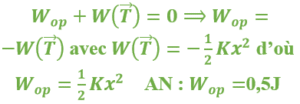 Un opérateur tire lentement sur un ressort de longueur à vide l0 = 25 cm, de raideur K = 100N/m. Celui-ci s’allonge alors de x = 10 cm à partir de sa longueur à vide. Quel est le travail fourni par cet opérateur ?