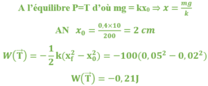 Un ressort de raideur k = 200 N/m est fixé en un point A. A l’extrémité libre on accroche une masse m = 400g, le ressort s’allonge de x0. De cette position on tire le ressort de 3 cm supplémentaires. Calcule le travail effectué par la tension entre x0 et sa position finale. g =10 S.I